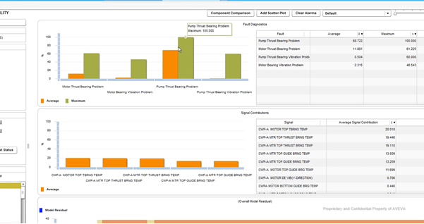 - 振動監控類似 DCS 的 High/High 類型警報限制,其實是難以針對各操作條件做動態調整。AVEVA™ Predictive Analytics 能提供預警模式識別的警報,並以設備所有傳感器數據,如溫度、壓力、流速及振動等建立模型,可全面了解資產的運行狀況,以及當前操作條件下各數據的正常範圍。因此使用者能夠識別設備運轉時的細微變化,而這些細微變化通常是即將發生的設備故障的預警信號。