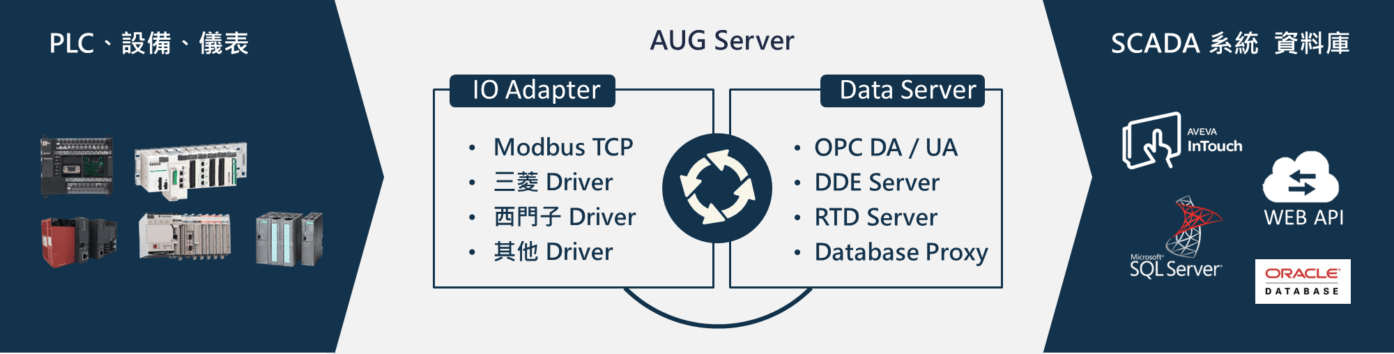 工業通訊整合平台 (AUG) 不是市面上一般的工業通訊協定 Driver ,而是一套能整合「工業界常用通訊協定」的軟體平台。